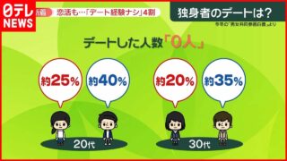 ニュース 【内閣府”公表”】20代”未婚・恋人ナシ” 男性7割女性5割 内閣府が14日公表した今年の「男女共同参画白書」では、現代ならではの価値観が浮き彫りになりました。デート経験がゼロという独身の20代男性は約40%で、結婚の意思がないのは30代男女で25%以上。既婚者の約15%は「離婚の可能性あり」でし... 2025.09.03 ニュース